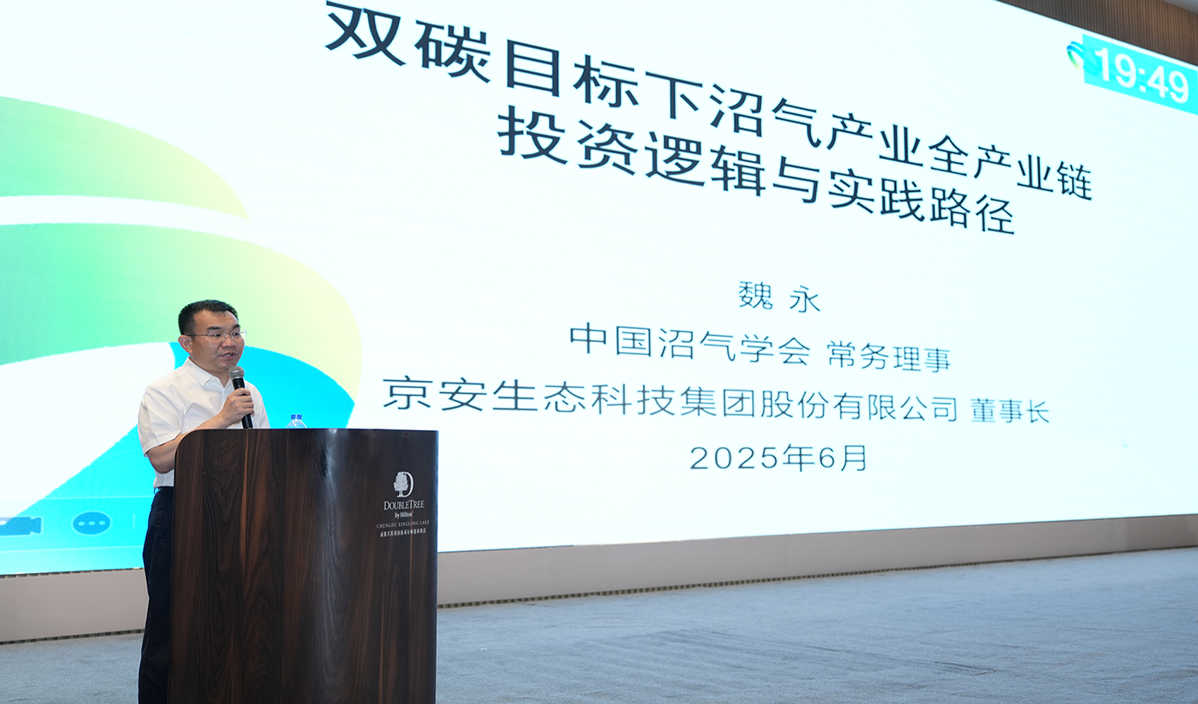 公司董事长魏永带队参加本次论坛,,,并作了题为“双碳目标下沼气产业全产业链投资逻辑与实践路径”的主题报告,,,,介绍了沼气项目具有的显著的战略价值和广阔的市场前景,,是“双碳”背景下极具吸引力的投资方向之一。。。。其核心价值在于将环境治理压力转化为资源循环利用和清洁能源生产的动力。。。。建议行业同人戮力同心,,,,加强对外合作交流,,,,促进生物天然气绿色生态价值的标准核准和国际互联互通,,为国家提出的双碳目标奋斗。。
