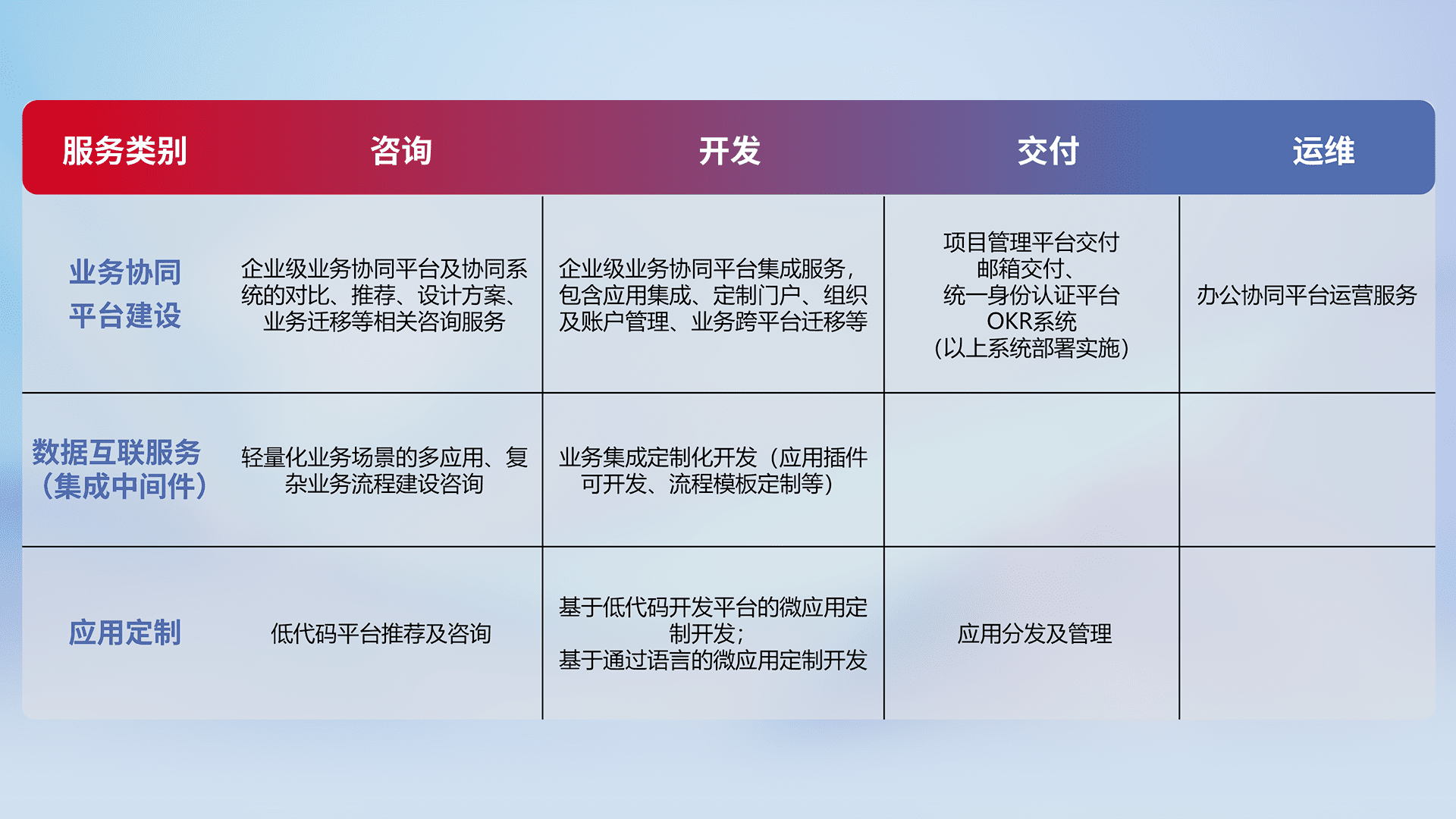 针对钉钉、、企微、、、、IDaas等平台级产品提供产品的规划、、、、方案、、、、交付、、定制化开发等服务,,实现如统一协同办公、、、智能客户服务、、、混合会议管理、、、、智能数据查询、、等业务场景,,,,实现数字化转型。。