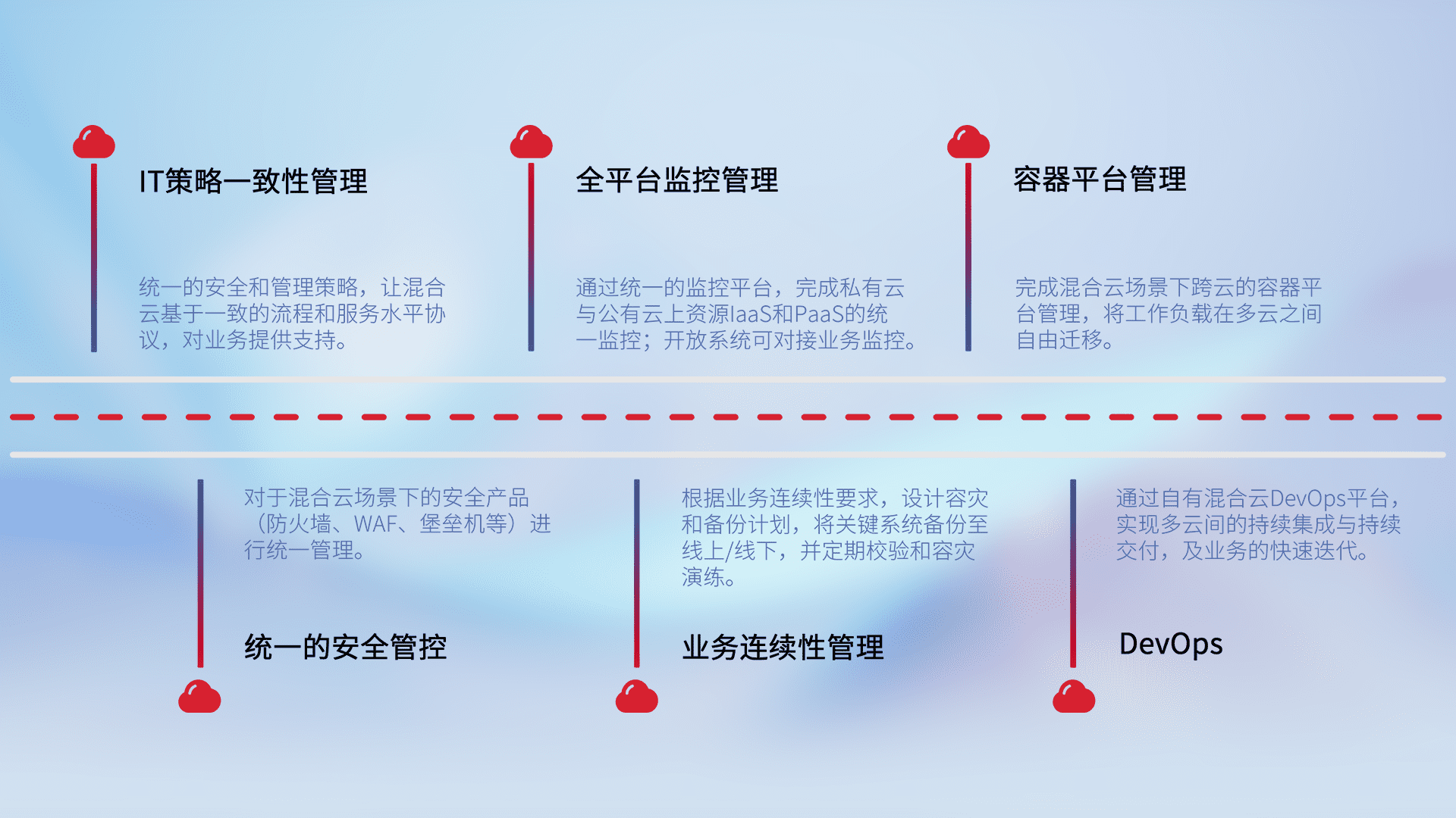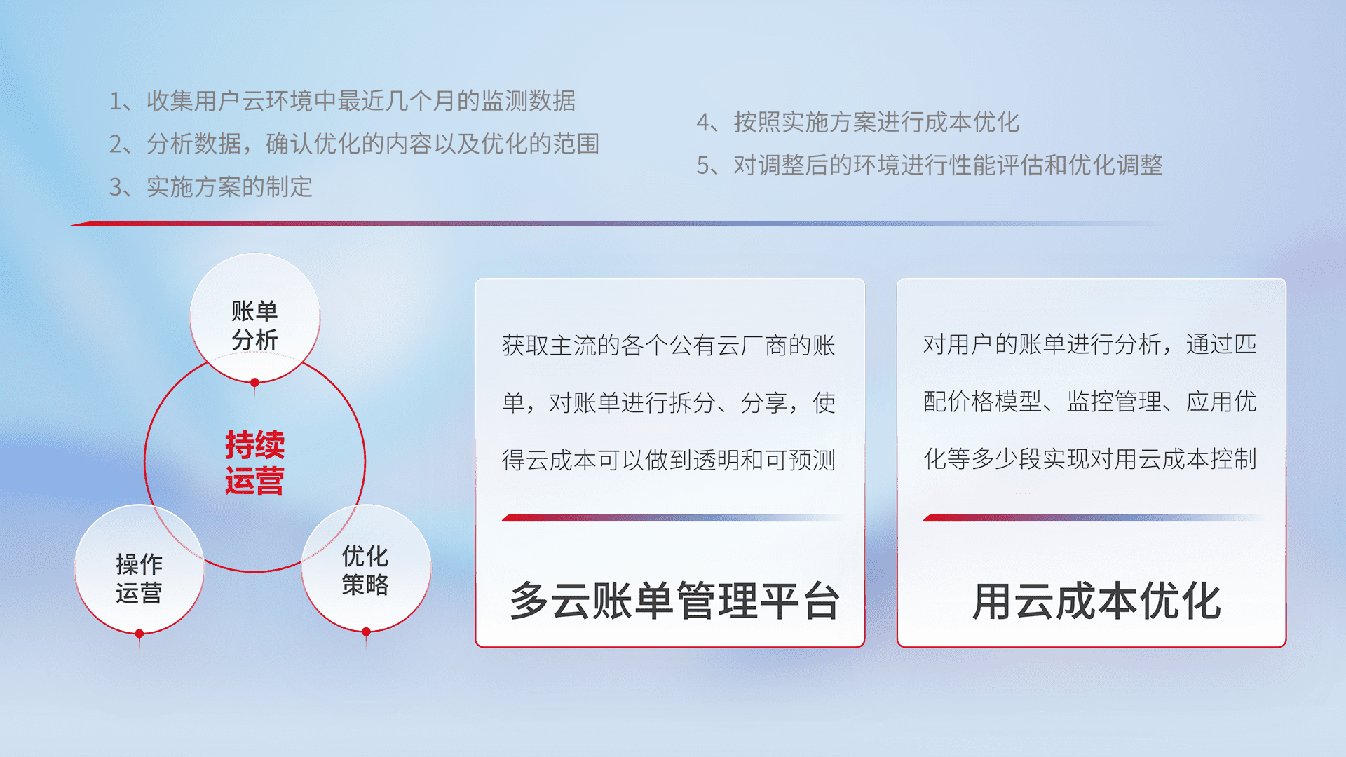 通过多云纳管,,以统一的资源数据模型把客户的云资源进行抽象和封装,,,进而实现对多云资源的统一操作,,保障云资源管理的可靠性、、、、稳定性与可用性。。。。量身定制化运维内容,,,配置、、、开发运维、、、补丁管理、、、、备份、、监控、、、认证和访问管理、、、、审计和日常巡检等,,,,保障在用云过程中的可靠度,,,,稳定度以及高可用率。。